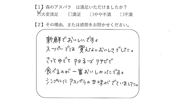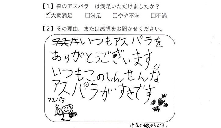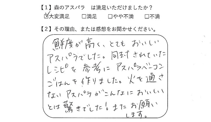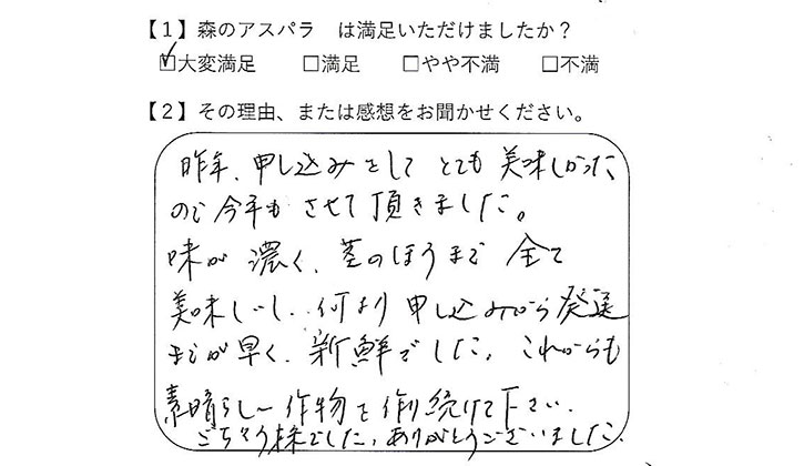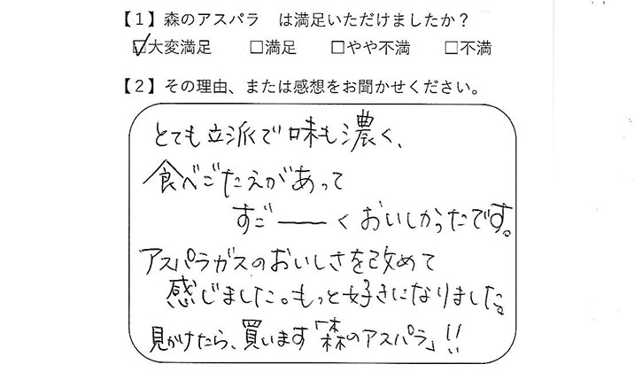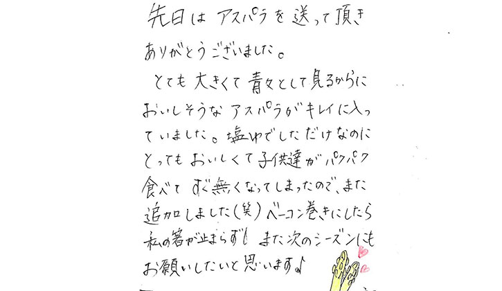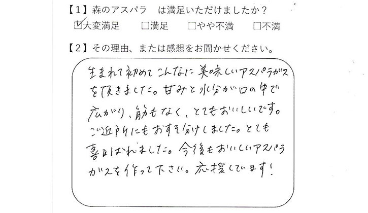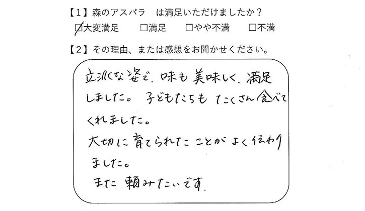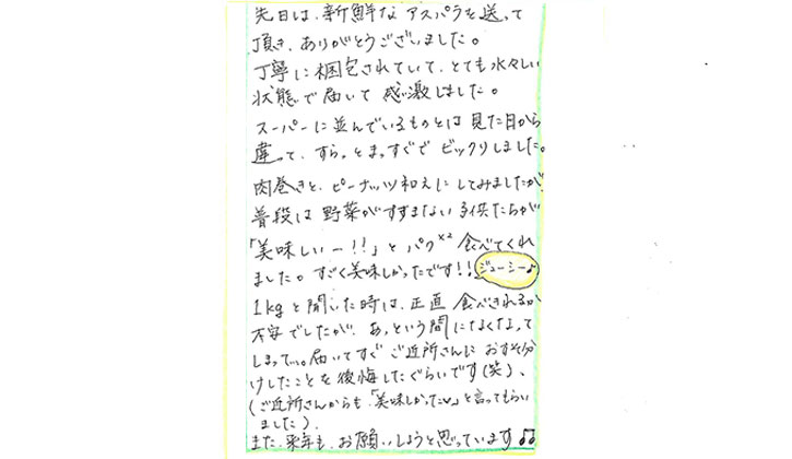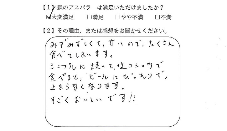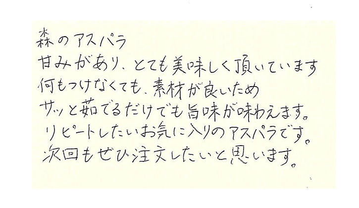 やわらかく、フルーツのような甘み、旨味の強い「森のアスパラ」は、独特の青臭さやえぐみが少なく、野菜嫌いのお子さんにも喜んでもらっています。 リピーターさんには 「お子様が食べるのが嬉しくて」 「いつものスーパーで買ってくると違いに気づかれてしまう」 「お弁当に入れてtおねだりされる」 などお喜びの声がたくさんです。 「ビールのつまみに最高」 「美味しくて栄養もとれて、罪悪感のないおやつ感覚で食べてしまいます」 など、大人の方にも喜んでもらっています。