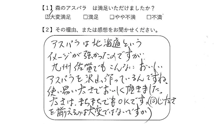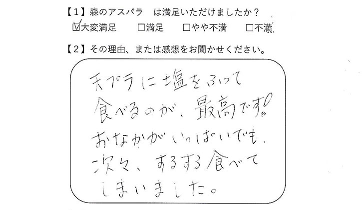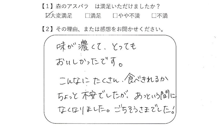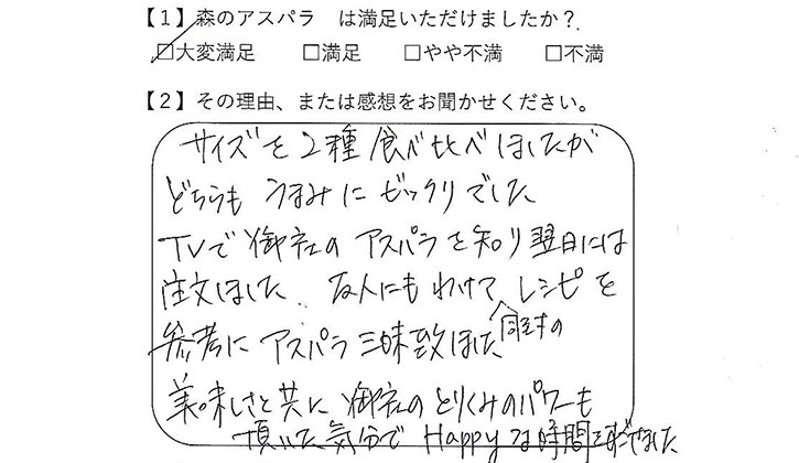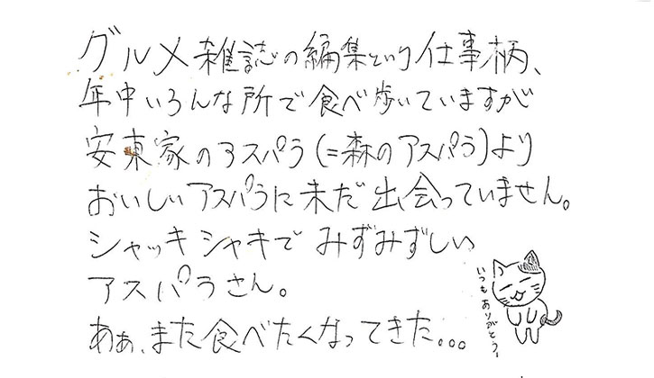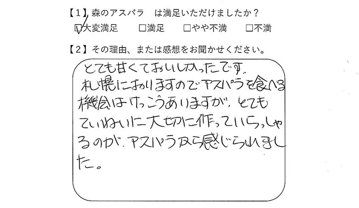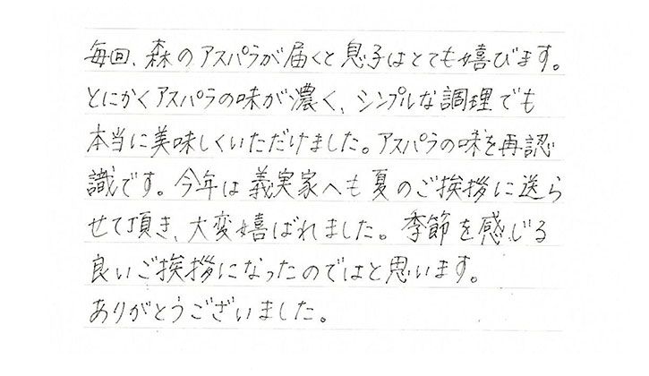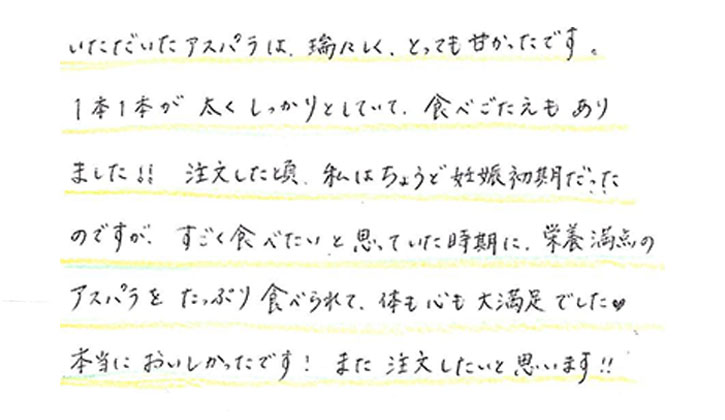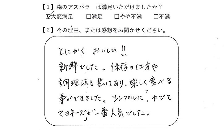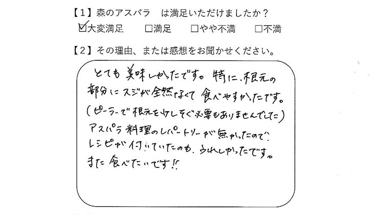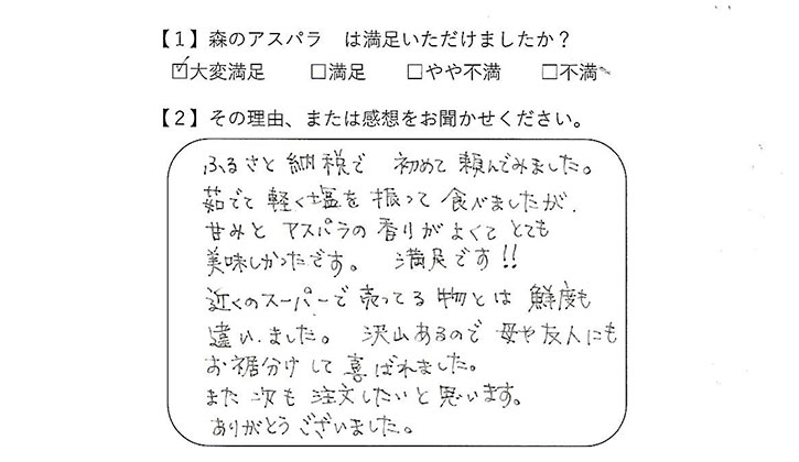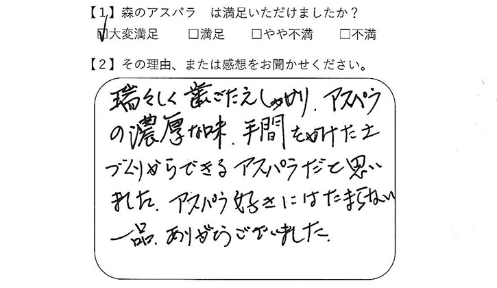 やわらかく、フルーツのような甘み、旨味の強い「森のアスパラ」は、独特の青臭さやえぐみが少なく、野菜嫌いのお子さんにも喜んでもらっています。 リピーターさんには 「お子様が食べるのが嬉しくて」 「いつものスーパーで買ってくると違いに気づかれてしまう」 「お弁当に入れてtおねだりされる」 などお喜びの声がたくさんです。 「ビールのつまみに最高」 「美味しくて栄養もとれて、罪悪感のないおやつ感覚で食べてしまいます」 など、大人の方にも喜んでもらっています。